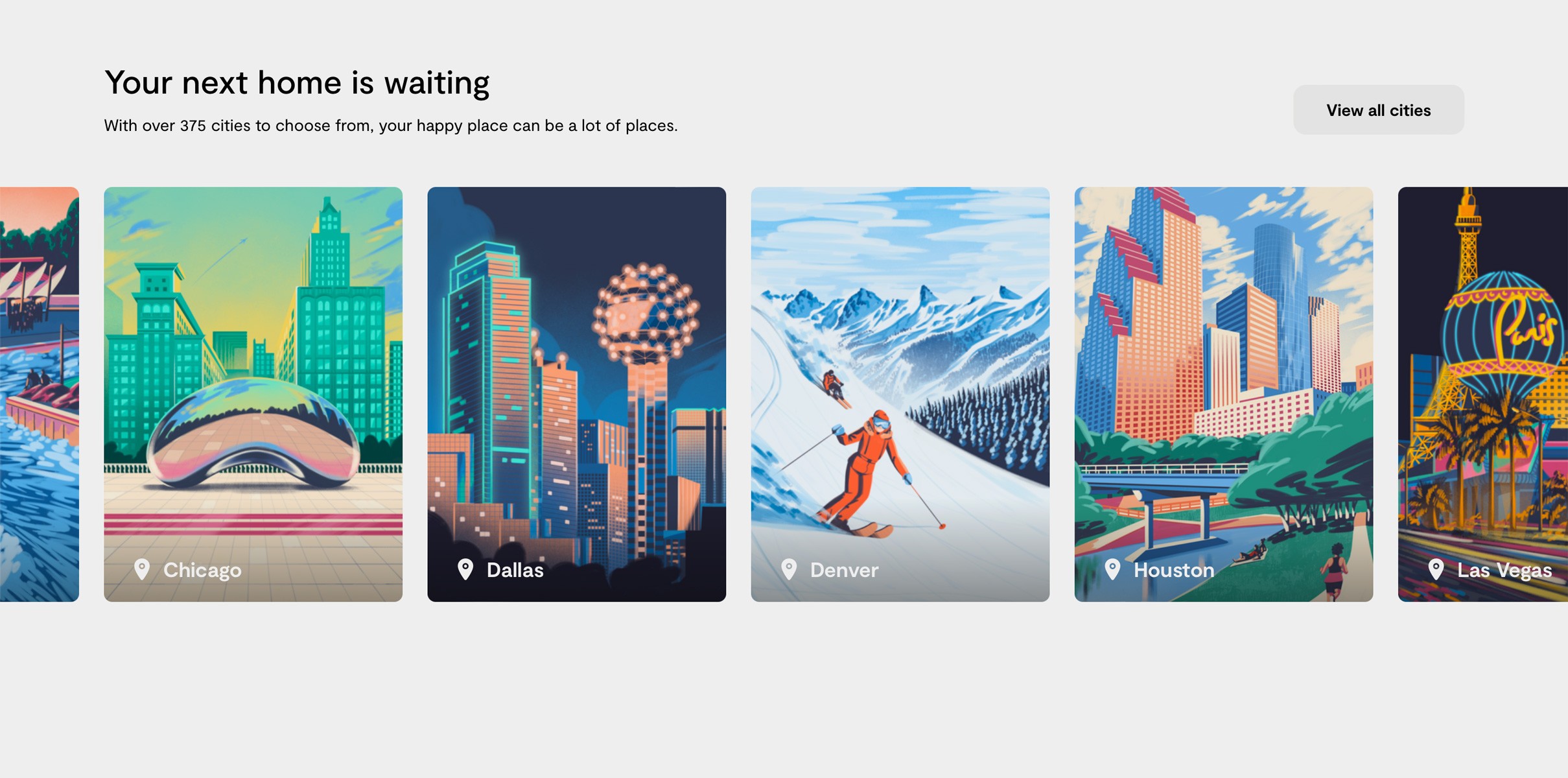 A 26-piece illustration library spanning the full geographic and cultural range of Landing's US presence, from the neon energy of Las Vegas to the quiet winters of Denver.