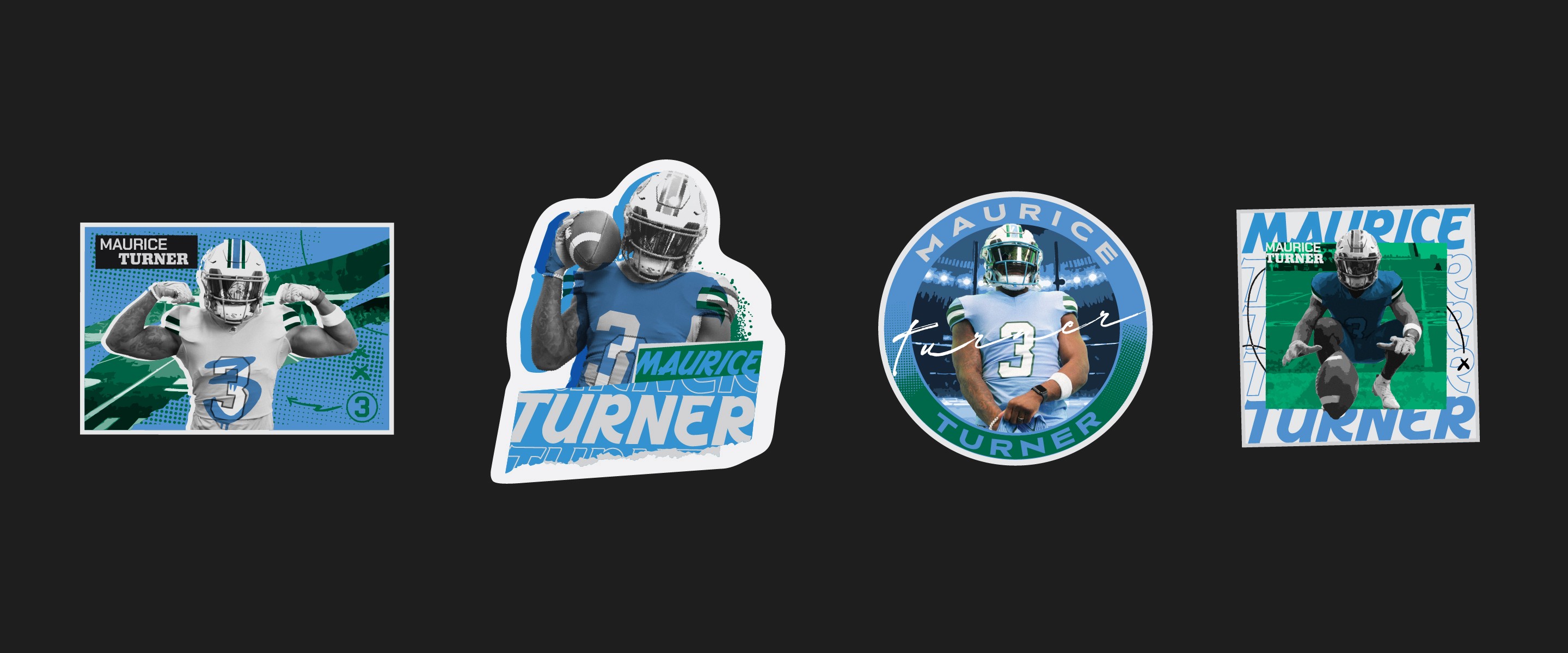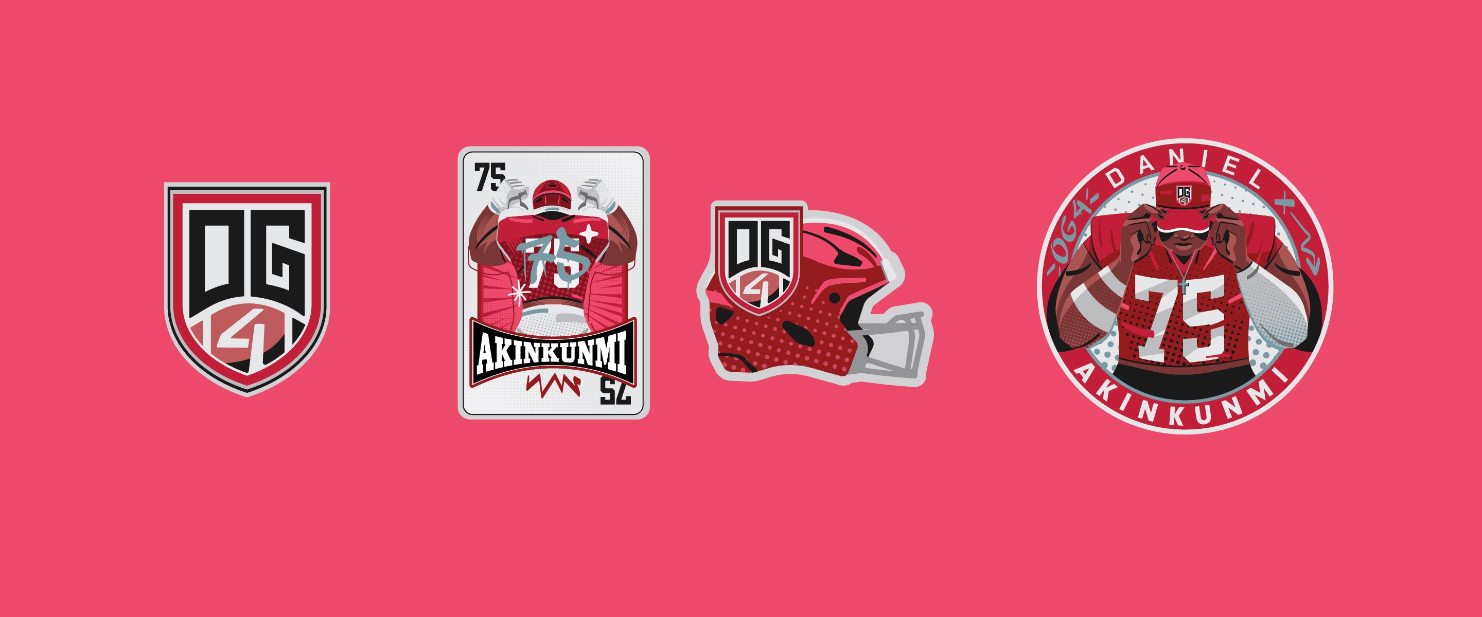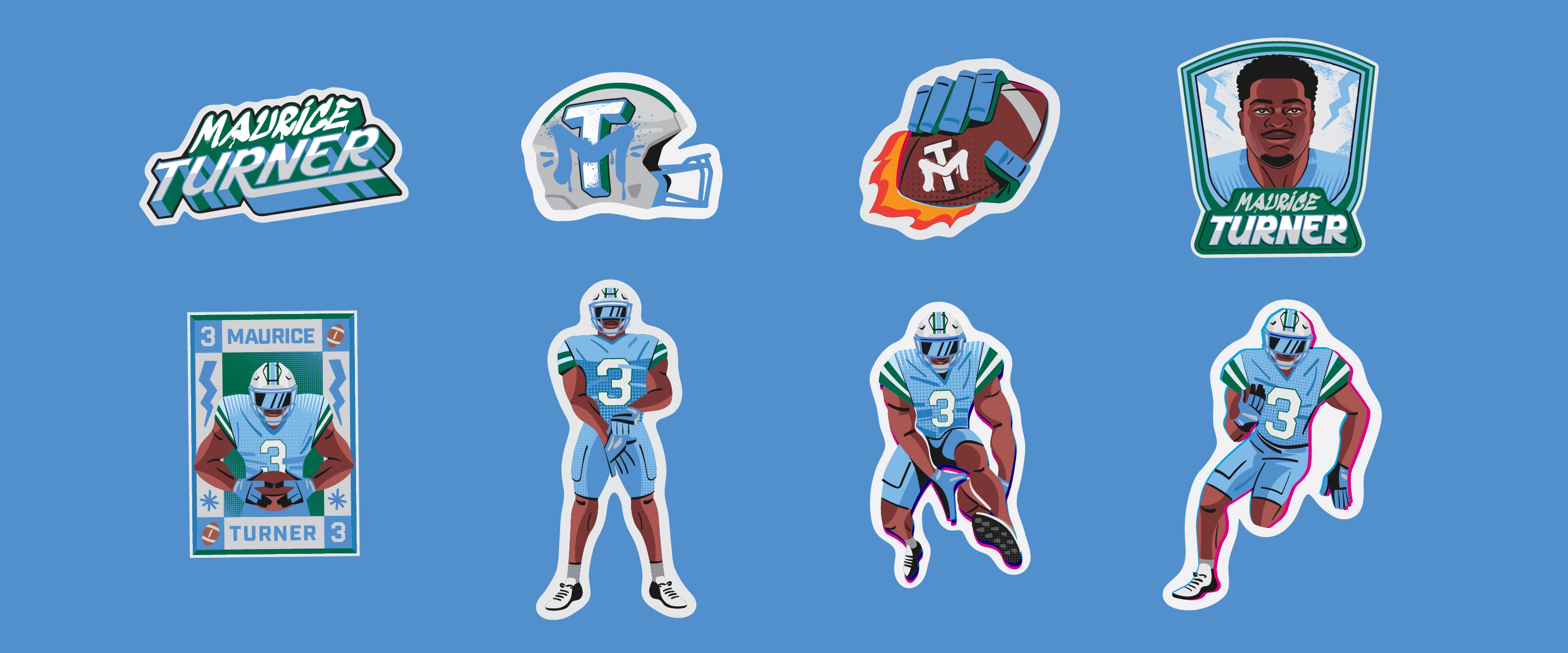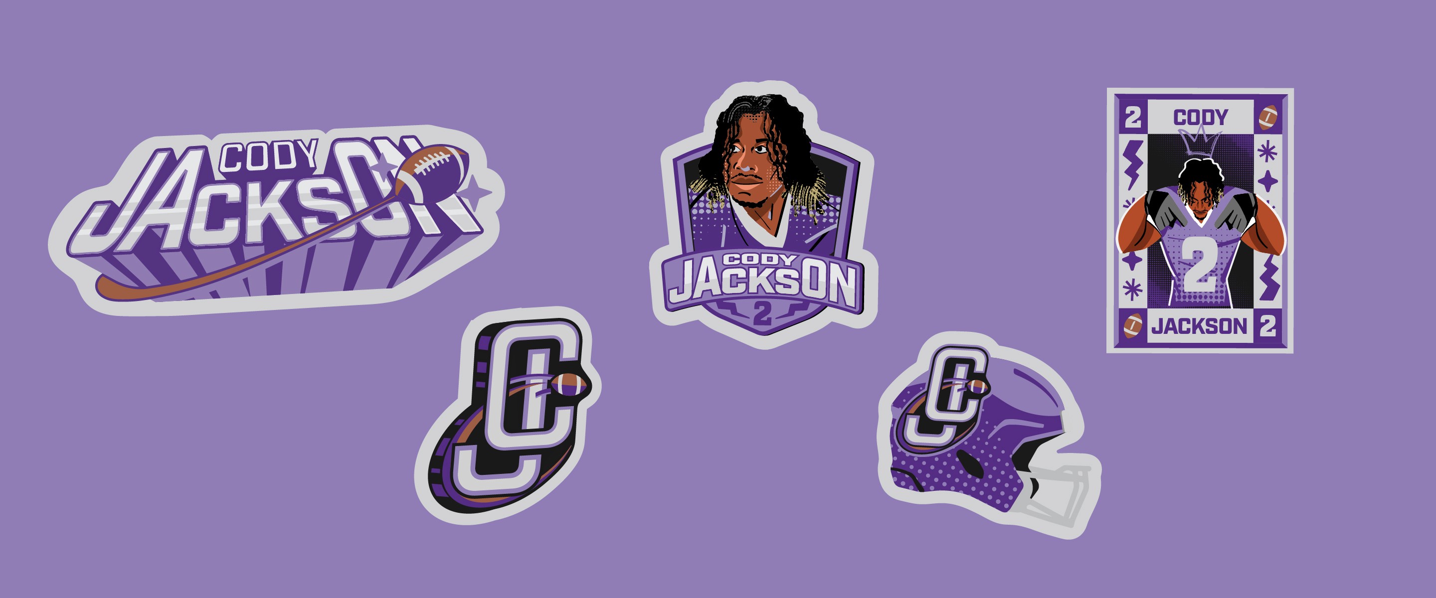 A series of custom merch systems designed for elite American football and basketball athletes, produced through Sticker Mule. Each athlete had their own store, but the work needed a consistent visual language across all of them — illustrated poses, logo design, and photo collages with a grungy, high-energy aesthetic that felt native to sports culture and fan merch.