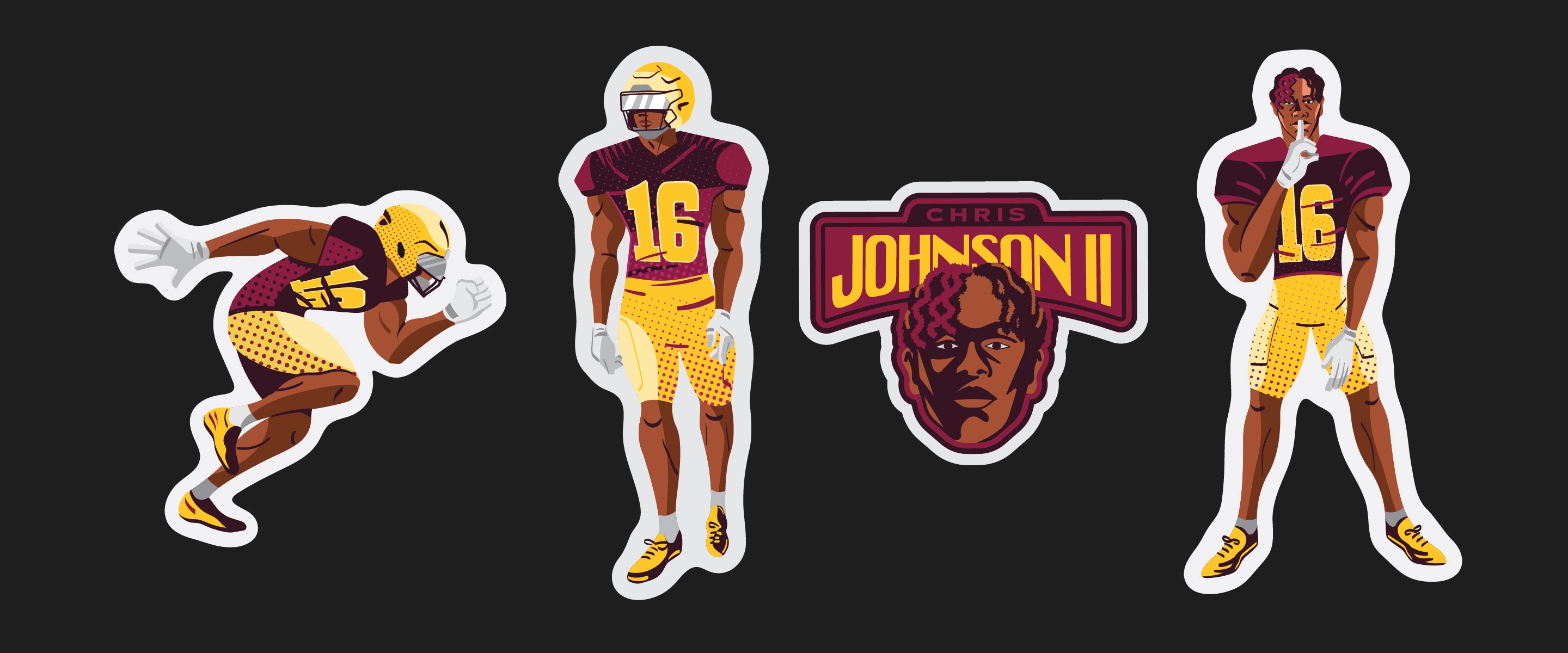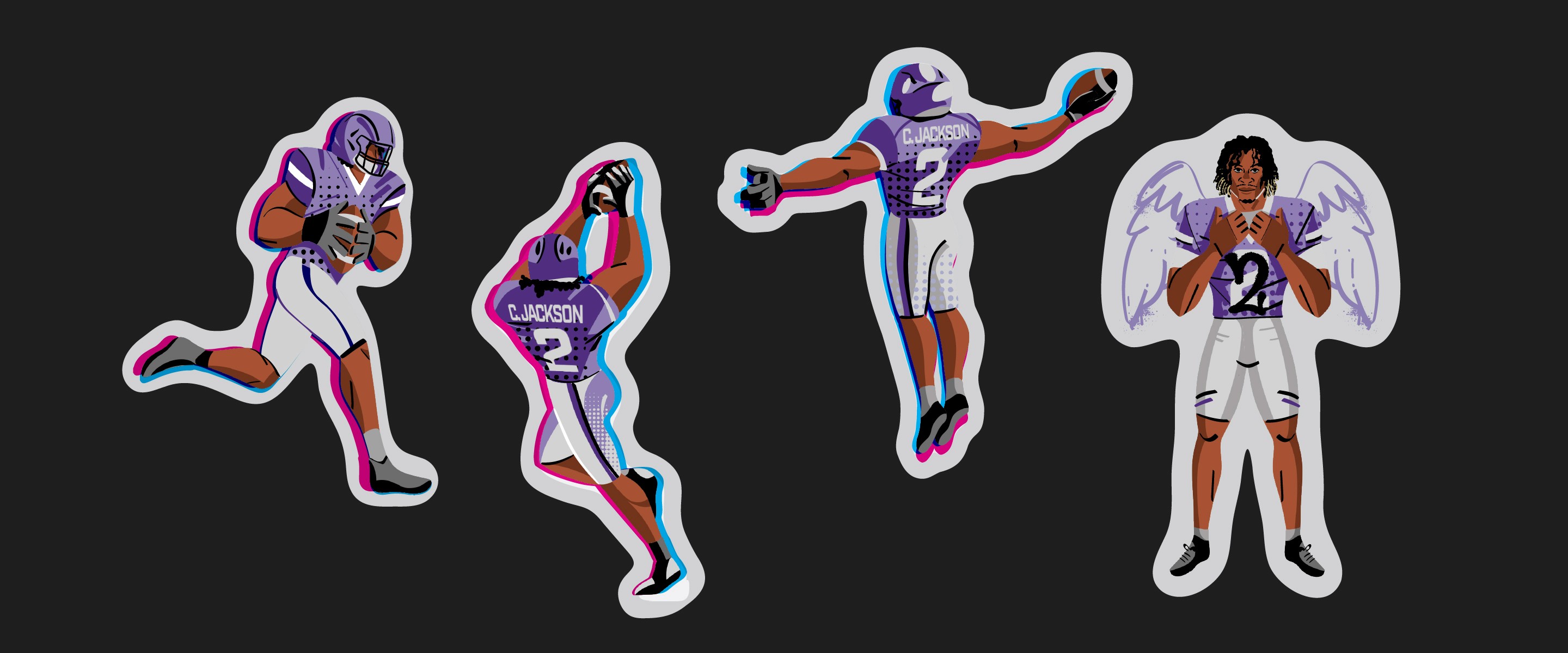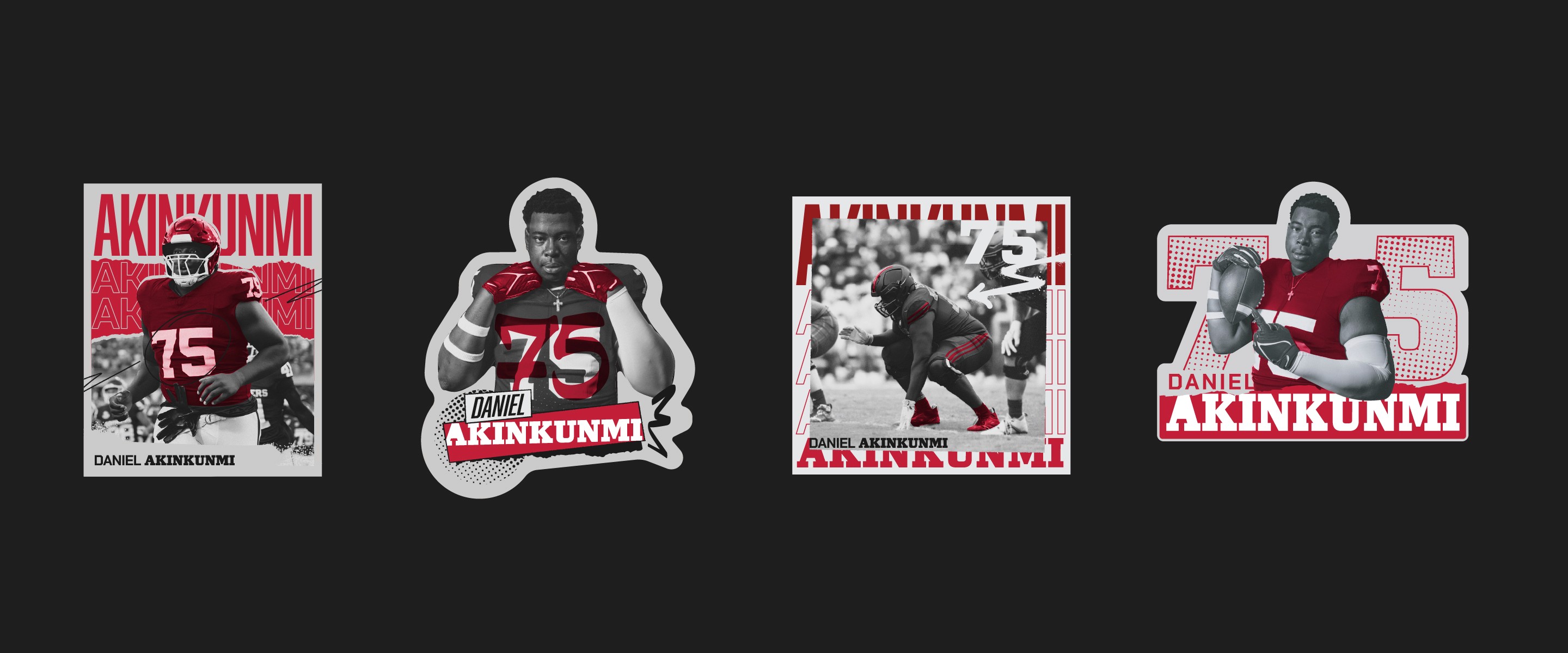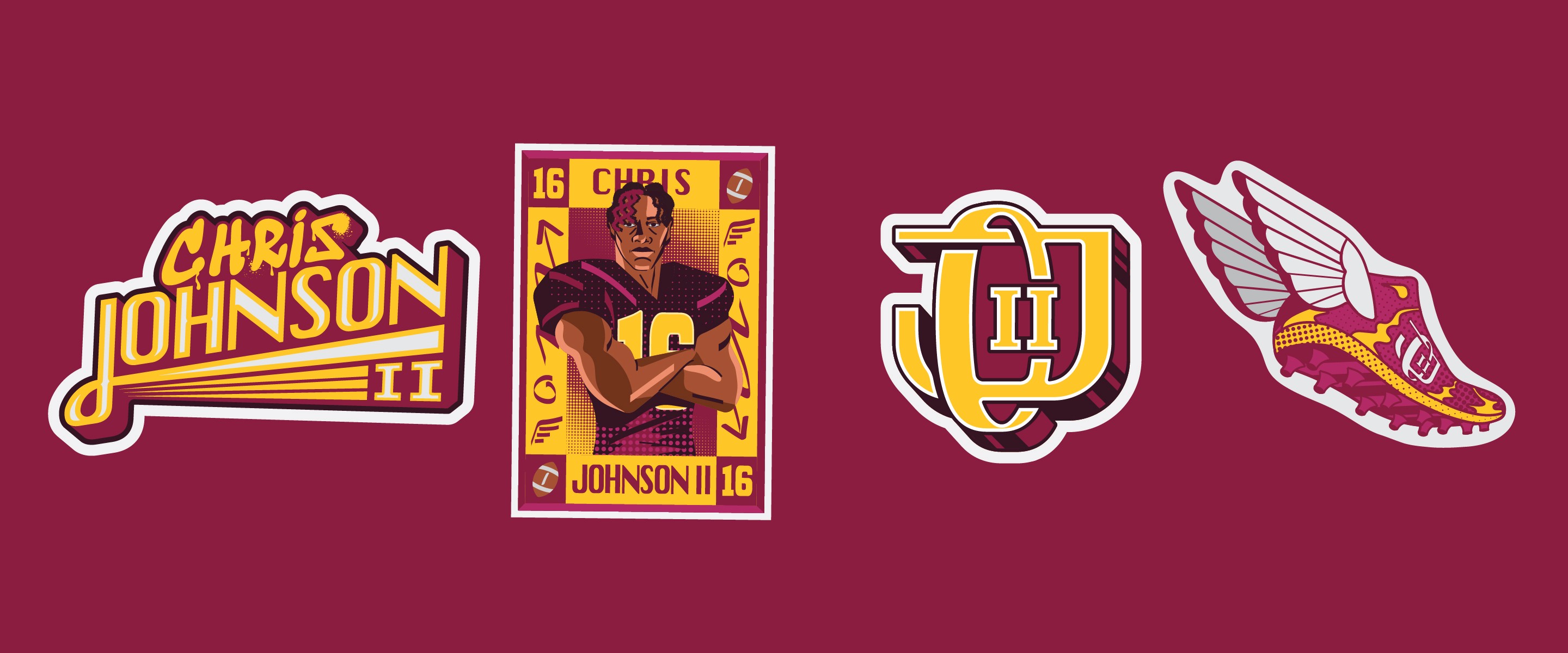 A series of custom merch systems designed for elite American football and basketball athletes, produced through Sticker Mule. Each athlete had their own store, but the work needed a consistent visual language across all of them — illustrated poses, logo design, and photo collages with a grungy, high-energy aesthetic that felt native to sports culture and fan merch.