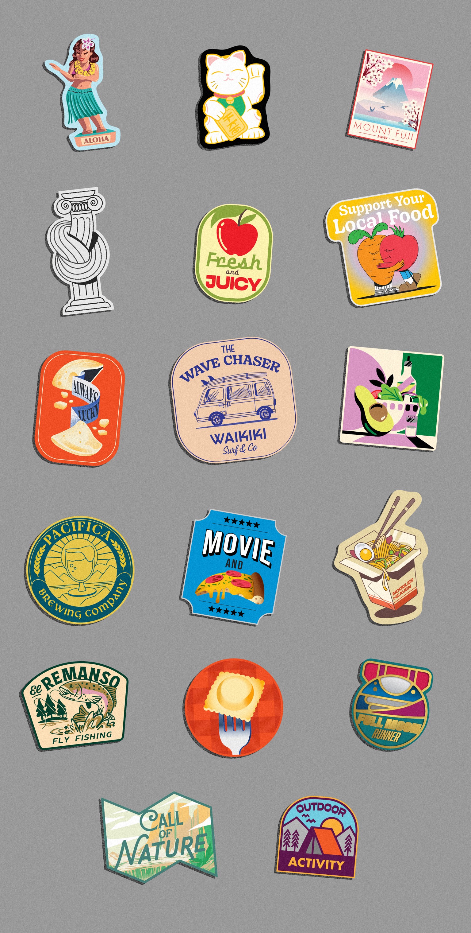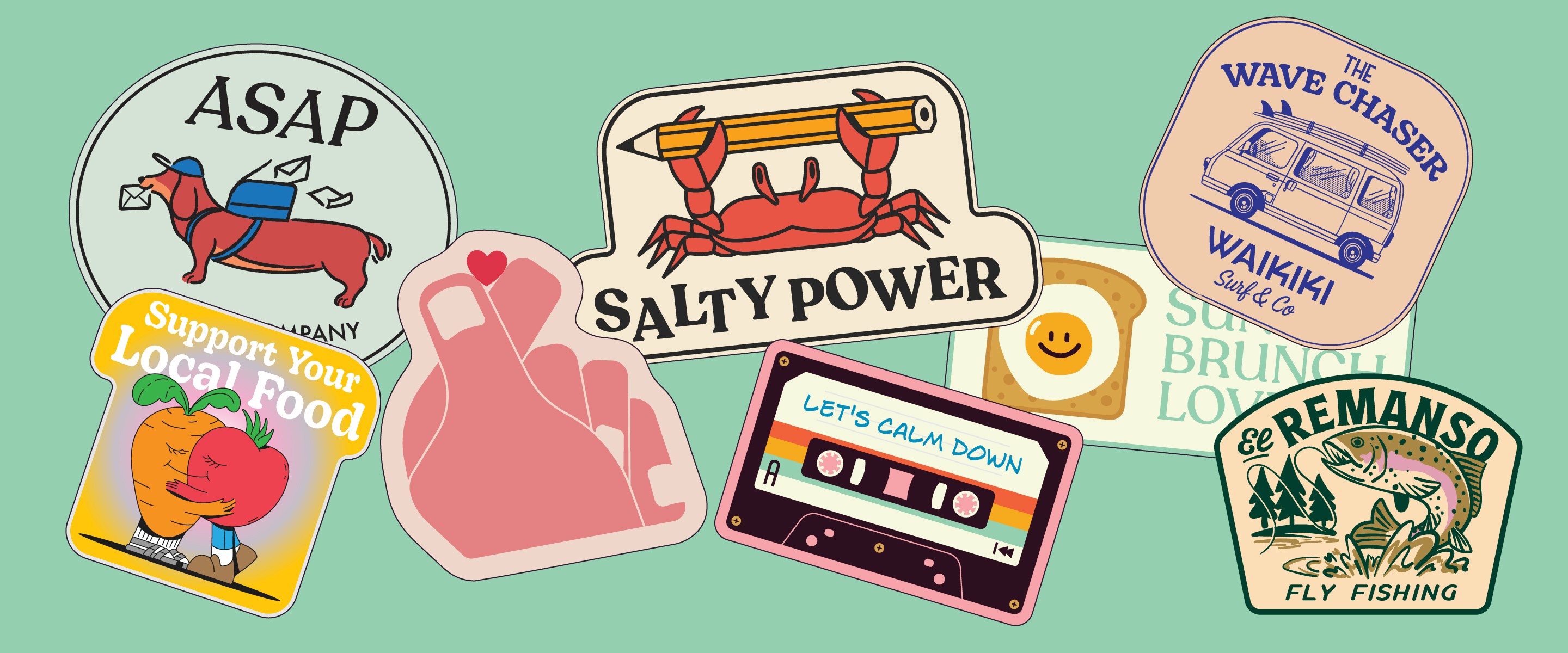 The collection embraces the culture of stickers as everyday objects: visuals that travel across laptops, notebooks, packaging, and public spaces. Through bold colors, simple compositions, and memorable silhouettes, the project turns humor and spontaneity into a cohesive set of collectible illustrations.